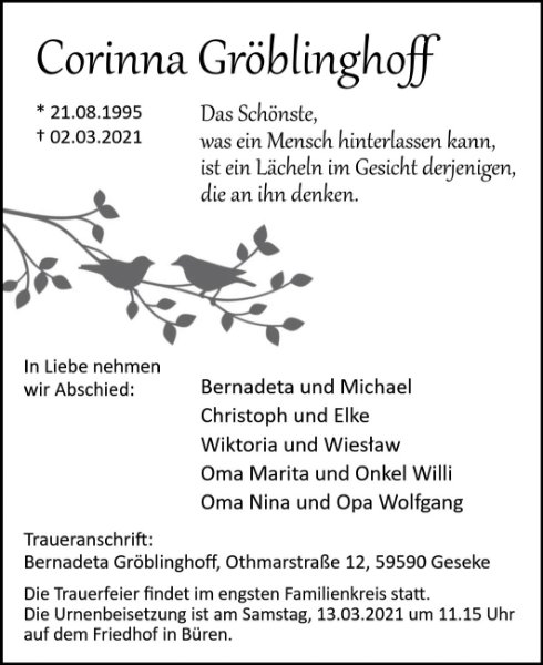 Liebe Frau Bernadeta Gröblinghoff, ich habe Ihnen in Facebook eine Nachricht geschrieben. Vielleicht können Sie diese bei Gelegenheit mal anschauen, da sind auch Bilder dabei die ich noch Zuhause habe von Corinna und mir!